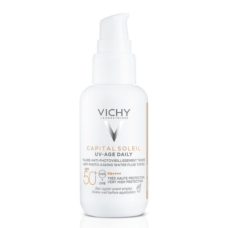 Vichy Capital Soleil UV-AGE Daily SPF50+ est un fluide solaire visage anti-âge qui protège efficacement la peau contre les UVA et UVB tout en luttant contre le photovieillissement. Sa formule enrichie en peptides et niacinamide aide à réduire les rides, les taches pigmentaires et la perte de fermeté, pour une peau plus lisse, éclatante et visiblement plus jeune au quotidien.